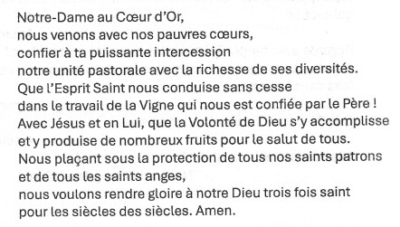 Père, avec nos pasteurs, avec le Christ, par Lui et en Lui, donne à chacun de nous et dans l’unité de nous mettre au service de l’Église et du Monde, dans le souffle de ton Esprit.